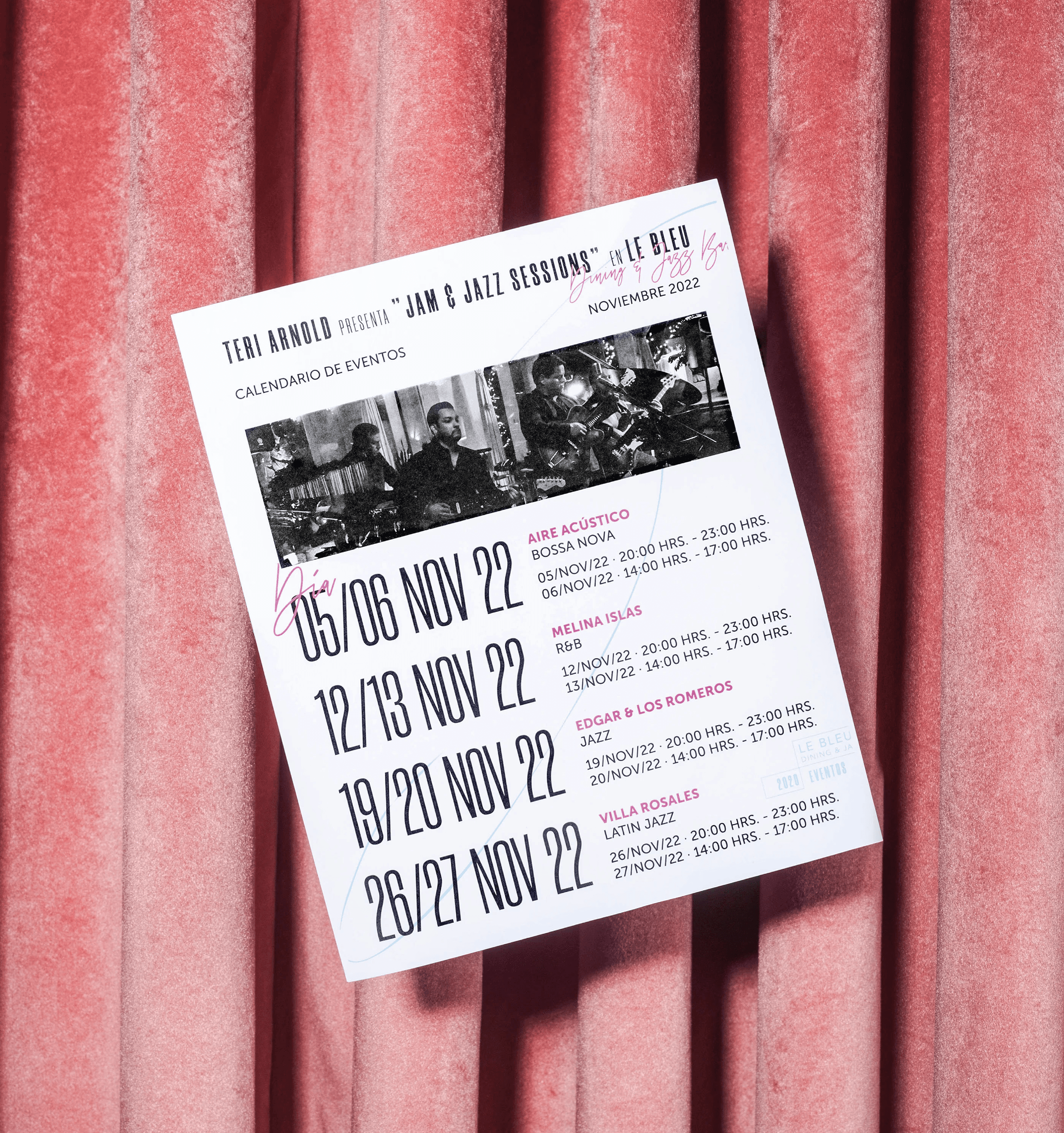 We developed Le Bleu’s identity inspired by the iconic jazz album covers of the 1960s, where graphic design was already used as an art form to visually express music. Drawing from the designs of that era, we incorporated black and white photography, bold typefaces, and irregular scripts, capturing that artistic and rebellious spirit.